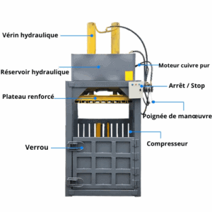 Une presse à balles = machine pour créer des balles de matériaux recyclables destinées à être revendues ou valorisées. Vous compactez du carton, du plastique, du papier, du métal propre pour en faire des cubes bien nets qui partent chez un recycleur.